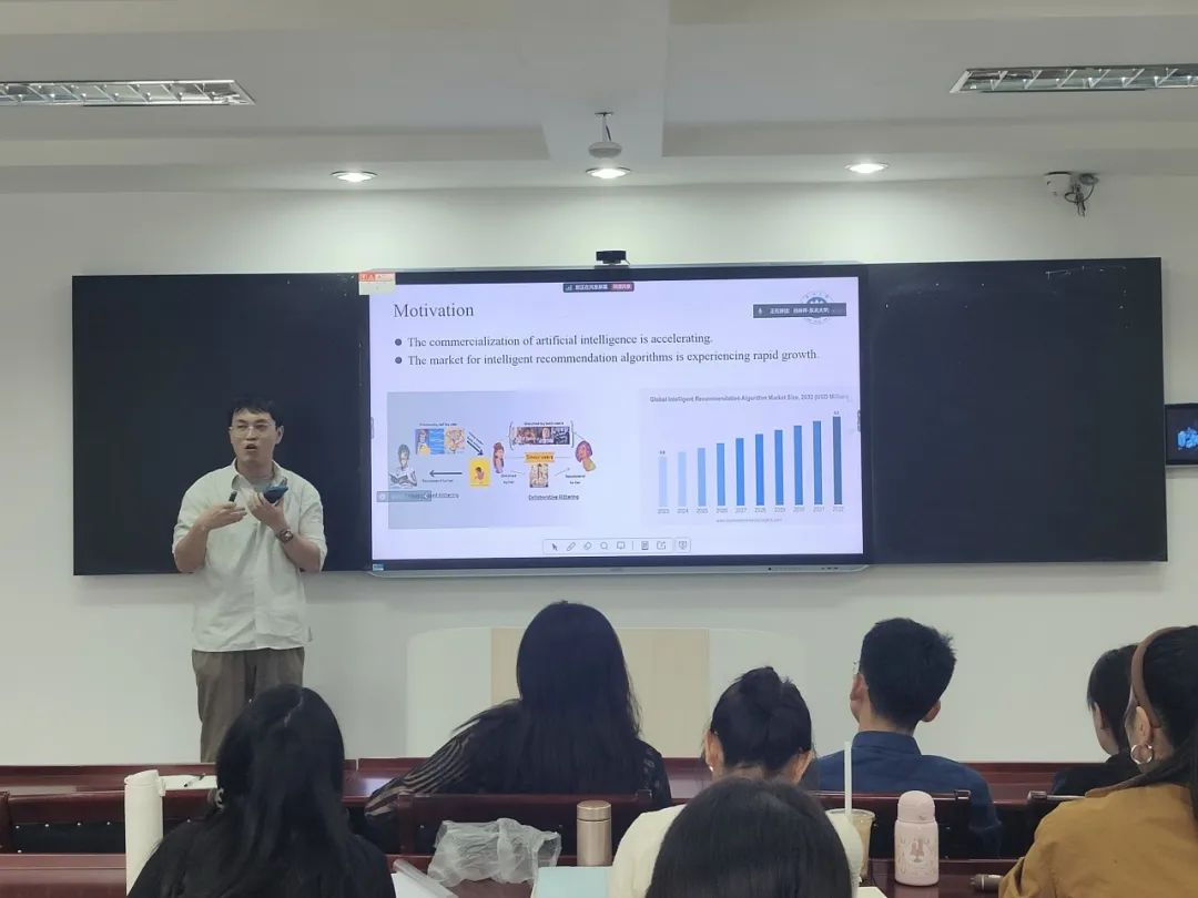 第二场报告中,东北大学管理学院的吕林祥博士为现场同学们深入讲解了《智能算法推荐对于消费者多元决策的负面影响及其优化》的报告。吕林祥博士在报告中阐述了智能推荐算法对消费者多元决策产生的双重影响。他首先列举了智能推荐算法的优势,包括简化选择过程、帮助发现感兴趣的内容、节省时间、个性化定制、减少无关干扰以及提高销售量。然而,他也提出了算法的不足之处:一是削弱消费者的独立判断力;二是限制了新奇事物的发现,缺乏偶遇惊喜的可能性;三是过滤观点,排除多元化视角;四是形成信息茧房和性别偏见,固化刻板印象,只放大相似观点而排斥对立意见;五是过度依赖技术和易受操纵的风险。他从消费者行为学的角度出发,分析了智能算法推荐系统可能带来的潜在问题,特别是对消费者多元决策的影响。同时,吕博士也分享了当下他正在研究的项目,例如关于优化算法设计,减少不良后果,提升用户体验,确保科技向善等等方面。