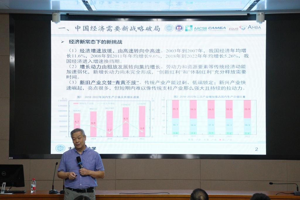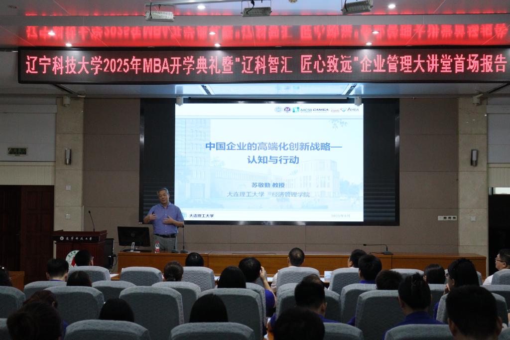 2025年8月30日,买球赛的网站工商管理学院迎来了一场思想盛宴——MBA2025级开学典礼暨“辽科智汇·匠心致远”企业管理大讲堂正式启动。首场报告特邀国家级领军人才、大连理工大学苏敬勤教授作题为《中国企业的高端化战略—从认知到行动》的专题演讲。讲座由工商管理学院院长金玉然教授主持,2025级全体MBA学员及部分教师参与本次论坛。