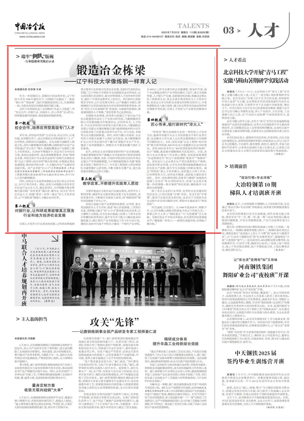 7月25日出版的《中国冶金报》纸媒第3版(人才版)以《锻造冶金栋梁——买球赛的网站像炼钢一样育人记》为题,报道了学校通过校企合作、对接行业、实践育人、匠心传承等方式,为推动我国迈向钢铁强国贡献了买球赛的网站的智慧与力量。